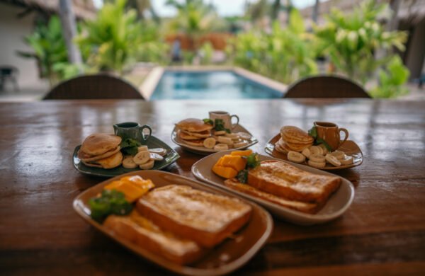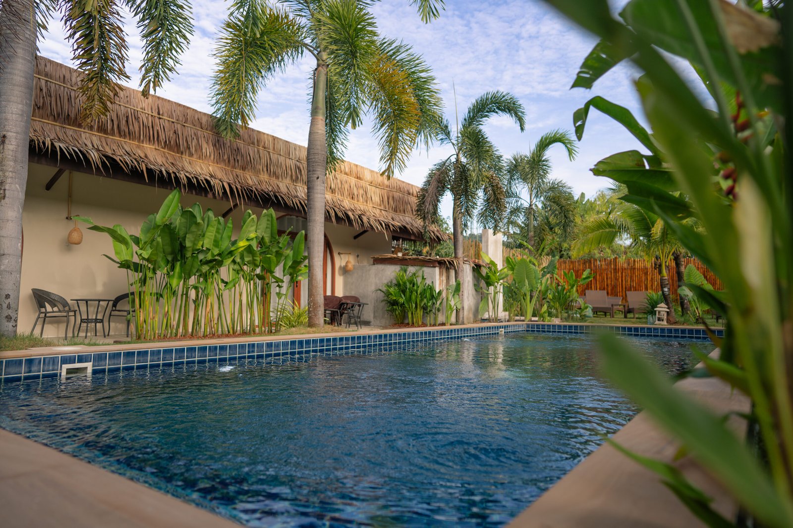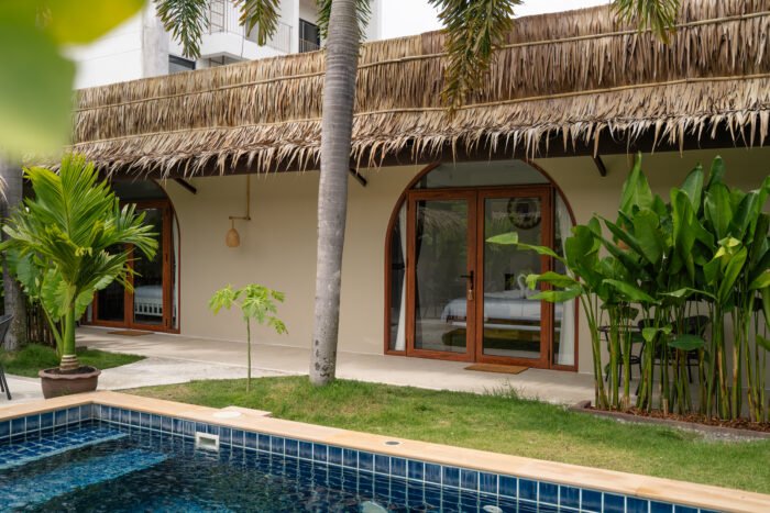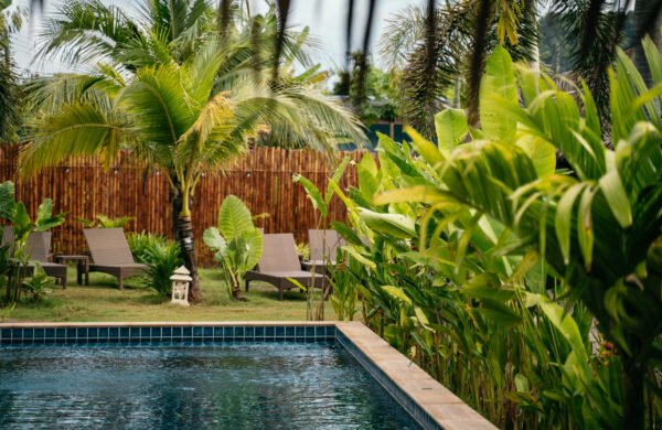 Our outdoor pool, surrounded by greenery and Balinese-inspired decor, provides a peaceful setting to relax or enjoy a refreshing swim beneath the palm trees.